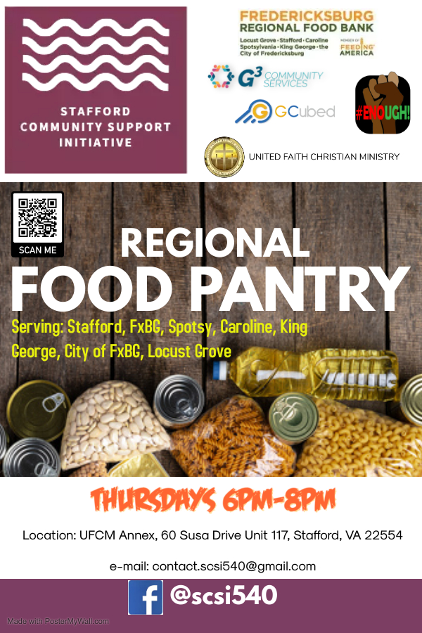 The Regional Food Pantry is available to King George residents every Thursday (6 pm-8 pm) at UFCM Annex, 60 Susa Drive, Unit 117, Stafford, VA 22554. Click for a brochure (PDF).